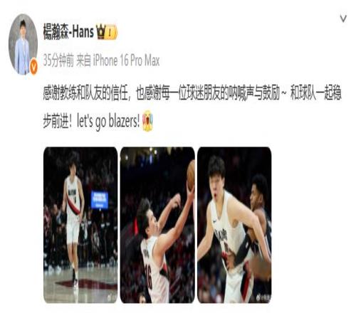 杨瀚森赛后更新社媒:感谢大家的鼓励,摆正心态,继续前进!