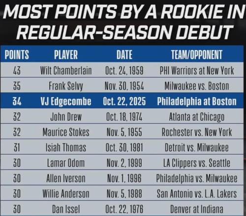 据悉,埃奇库姆今年刚满20岁,身高198cm,来自巴哈马,是2025年的首轮3号秀,也就是我们常说的探花郎。作为一个新秀,第一场比赛就以50%的命中率砍下34+7的数据,着实让人吃惊,要知道这可是自张伯伦之后,NBA新秀球员首秀最高分。之前,当96黄金一代的状元艾弗森首秀砍下30分时,球迷就表示费城的新王来了,这次埃奇库姆能砍下34+7,同样说明他足够优秀,未来很可能成为联盟顶级球星之一。