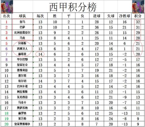 西甲最新积分战报赫塔菲止连败颓势差马竞8分皇马只领先巴萨1分