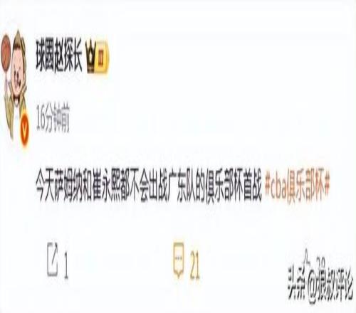 根据媒体人“球圈赵探长”报道,今天萨姆纳和崔永熙都不会出战广东队的俱乐部杯首战。
